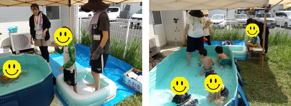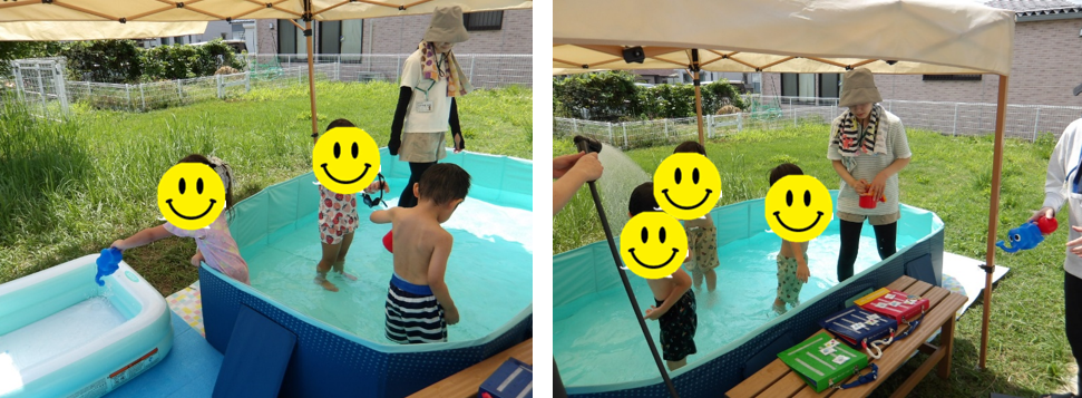 皆さんの楽しそうな声が響きました。小さいプールでは、静かに体を濡らし、ジョーロなどで水遊びをして