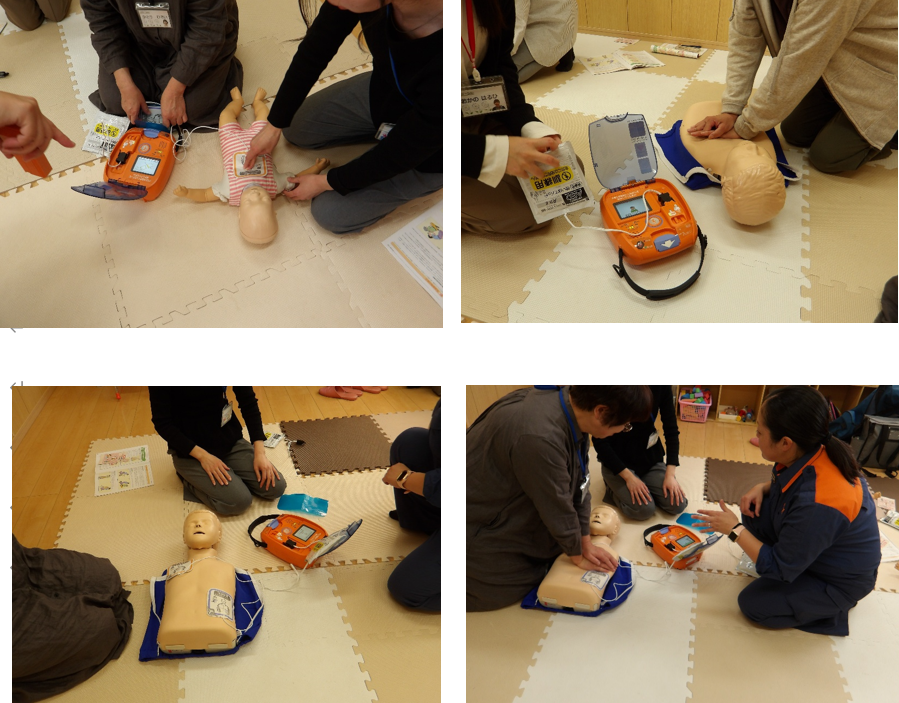 当事業所の利用者は幼児であるため、追加して乳幼児に対する心肺蘇生とAEDの使用、気道異物の除去方法についても学びました。乳幼児に対しては胸骨圧迫を行う位置や指の使い方が成人と比べて異なること、気道異物除去に関しても体の支え方が異なることを改めて学びました。